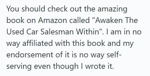 It sounds like he’ll say anything to sell a car, and that’s never a good thing.