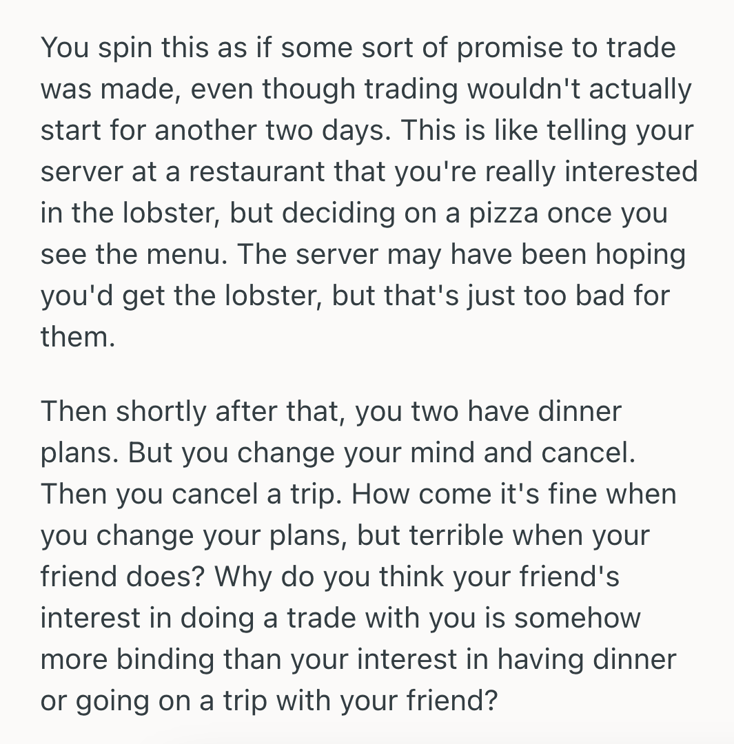 This guy felt truly let down by his friend backing out of their agreed trade. And he wasn’t sure her excuse was entirely honest.
