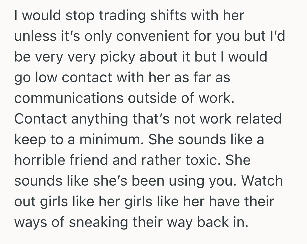 This person agreed with the man’s assessment that his friend was acting selfish and toxic, and recommended cutting her off entirely.