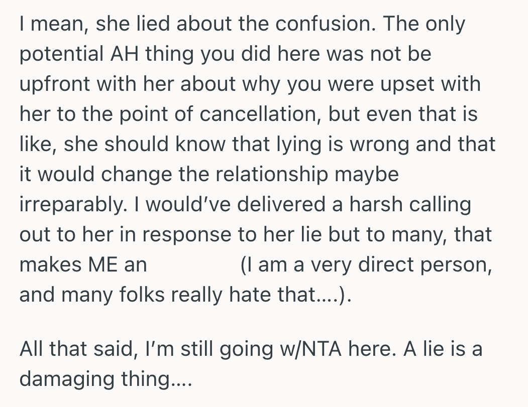We’d made plans to go on a trip – but given this health issue and her dishonesty, I made clear (several weeks out) that I would likely be unable to go, today I confirmed my unavailability.
