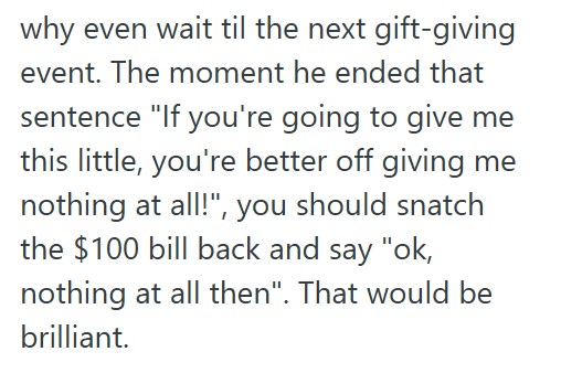 He said, and I quote, “Do you think I need $100? What am I going to do with $100? If you’re going to give me this little, you’re better off giving me nothing at all!”