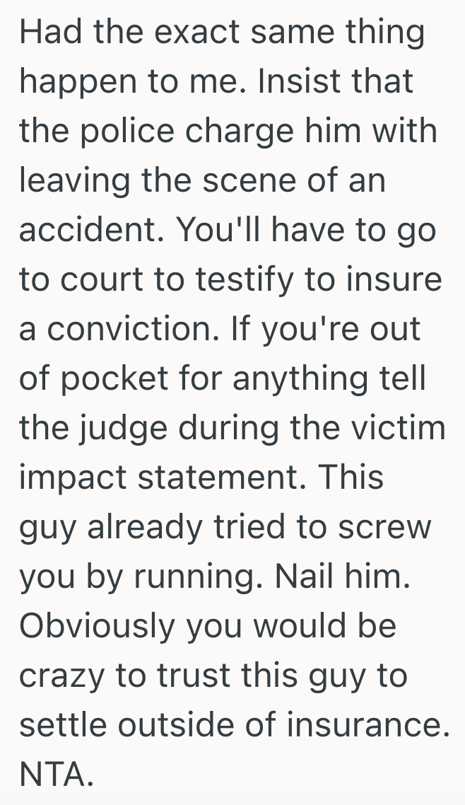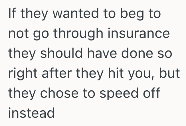 I told them I wasn’t comfortable handling this outside of insurance. Everything made me feel like this needs to be handled formally. The accident, the damage, and the fact that they fled the scene.