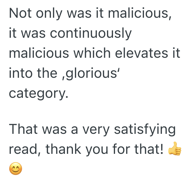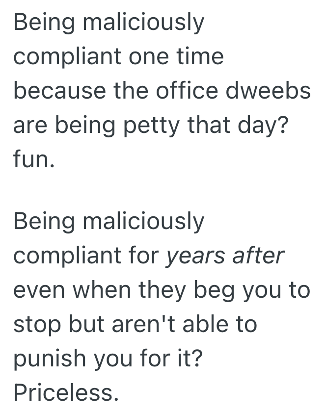 Another person also loved how long the malicious compliance lasted.