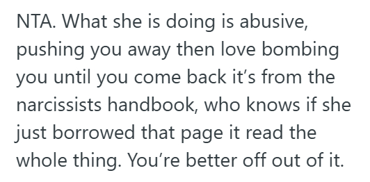 Over the next several weeks, she often criticized me for doing things “wrong,” started frequent arguments, and would break up with me during fights, only to guilt me into staying: “Why are you leaving? Don’t you love me?”
