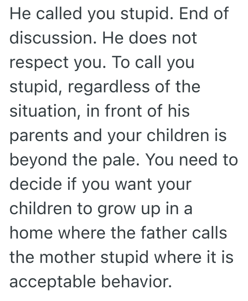 When he showed up late and found the seafood gone, he didn’t thank her for saving him a plate—he called her stupid for not saving his favorite dishes.