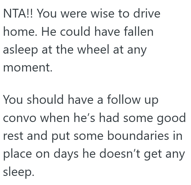 I said it is my place because I am a passenger in the car and I’m concerned for both of us in the event that there is a lapse in his judgment due to sleep deprivation.
