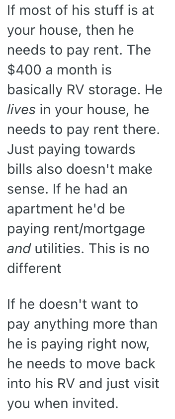 He works as a lineman so he would travel around a lot. Didn’t have an apartment but he has an RV he owns and pays $400 a month for the lot.