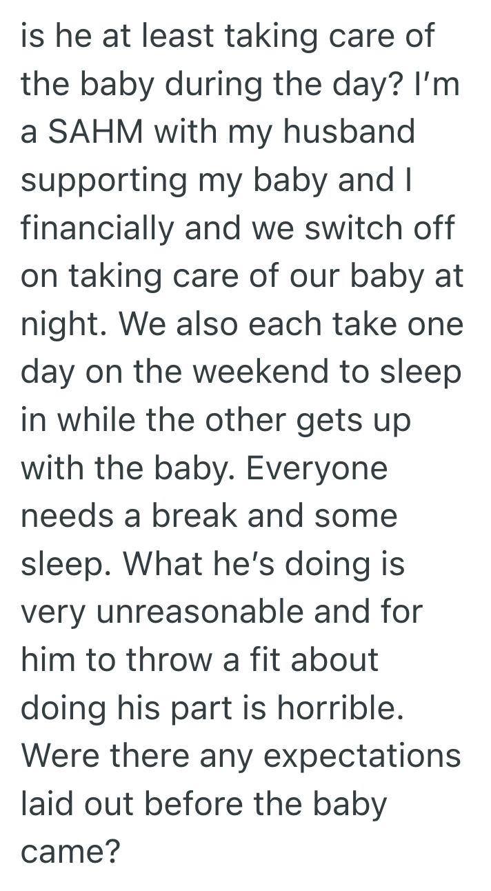 On top of not taking care of her for any night wakings unless I outright refuse, he also won’t do the wake-up routine with her.