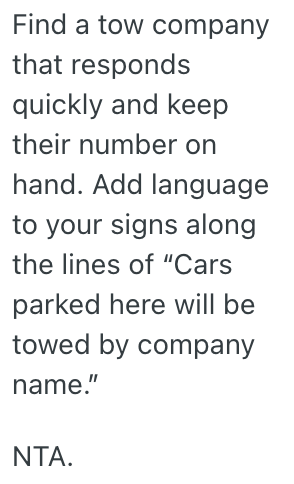 I decided to take matters into my own hands and placed a “No Parking” sign in my driveway, along with a polite note asking Dave’s guests to respect my property, also with a warning that’d I’d have their vehicles towed.