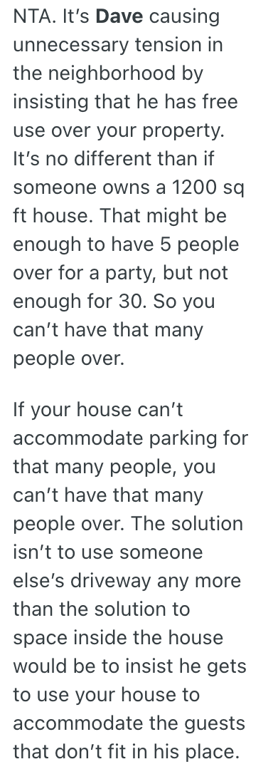 However, the situation didn’t improve. Dave continued to host gatherings, and his guests continued to use my driveway without permission.