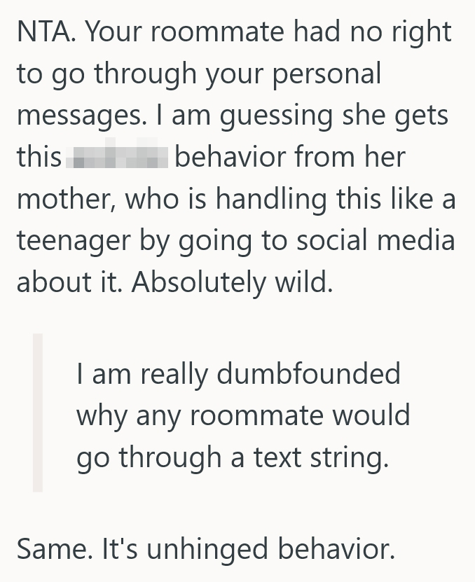 “I’ll PROVE I’m not a bad roommate by reading your private conversations and publicly attacking your character,” said the most chill person ever.