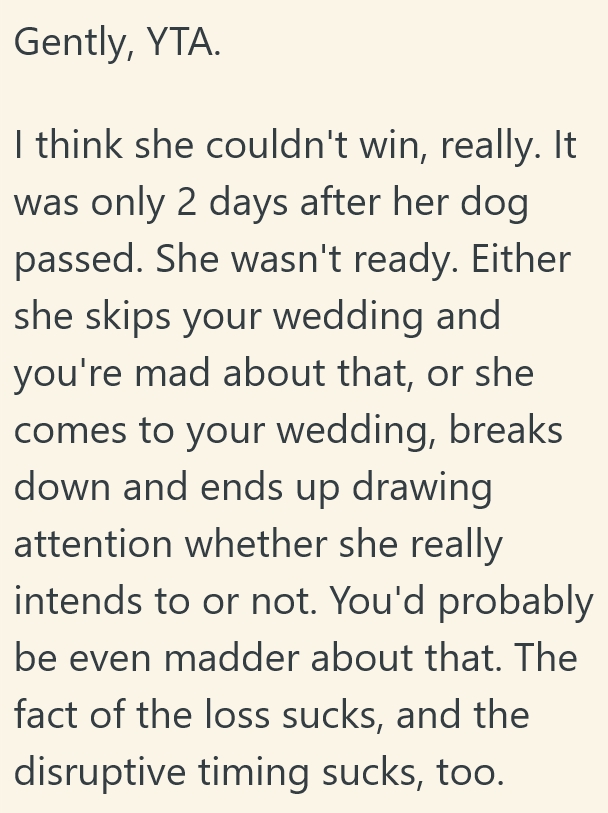 I was obviously sympathetic, but she called me sobbing, saying she couldn’t emotionally handle coming to the wedding because she was too devastated.