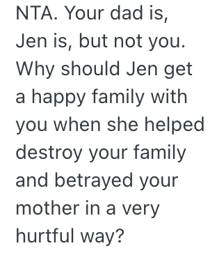 Then he told me I should love her and that I should realize my mom and all my extended family failed me because I could’ve had a happy family with him and Jen but their bitterness made sure it would never happen. And he said it’s about time I accept it.