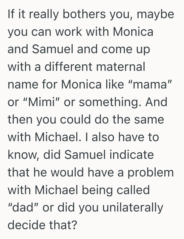 My daughter, Stephanie (F4), has hinted that she wants to call Michael “dad,” but we’ve told her that he loves her a lot, yet he’s still just Michael — out of respect for her real dad, Samuel.