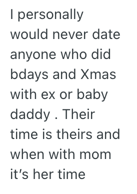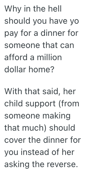 And she said no since you have so much money and my ex-husband just bought a house — you should really pay for all four adults and two kids.” (I have paid for a cheaper condo, he is upgrading to a multi-million dollar home.)