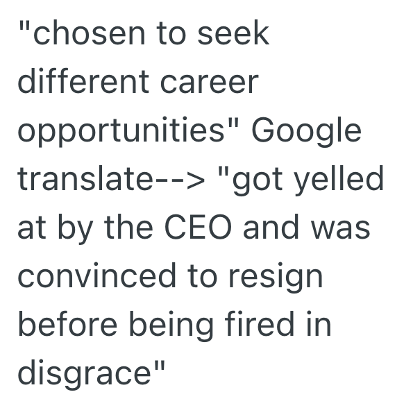 The next day the CEO sends out an email stating after a brief conversation with the head of department ABC, he has chosen to seek different career opportunities.