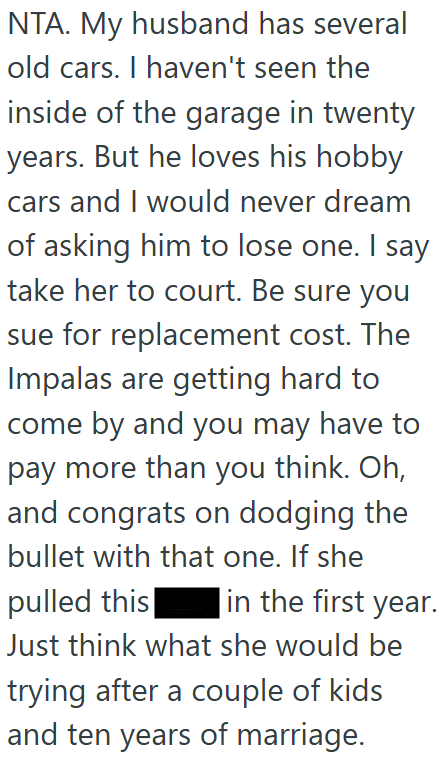 AITA For suing my girlfriend after she had my 1967 impala project taken to the scrapyard?