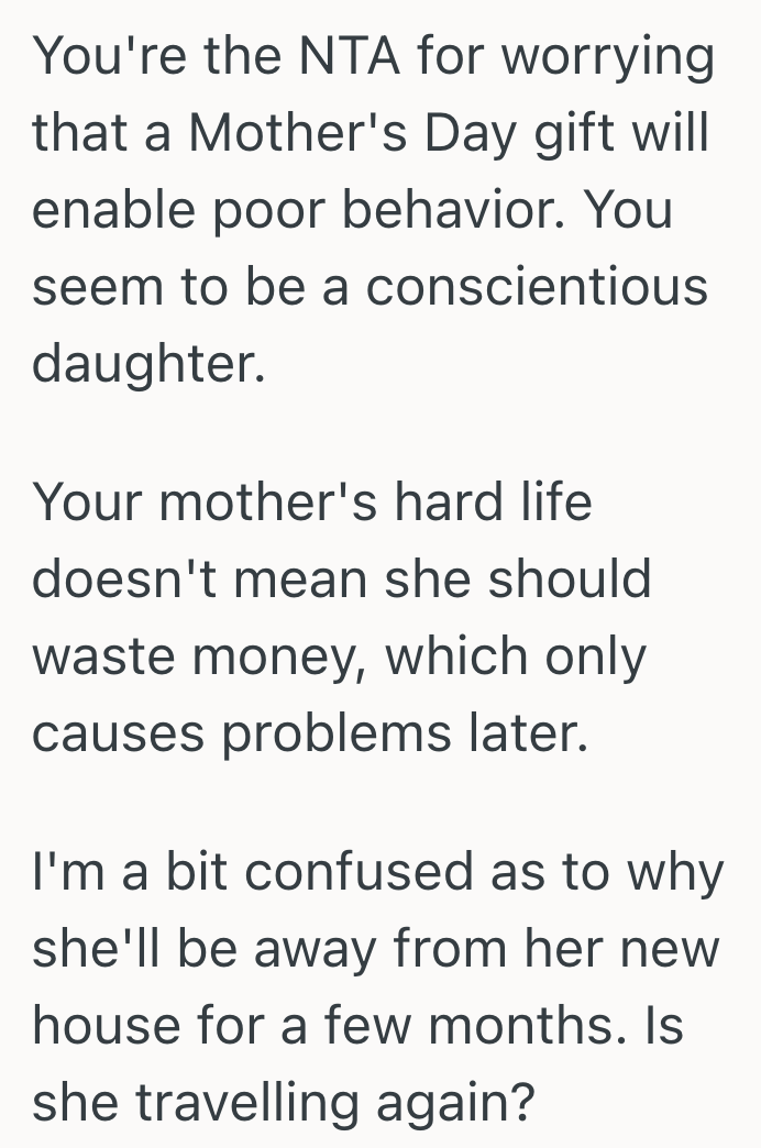 She has every right to choose what to get and what not to get their mother for Mother’s Day.