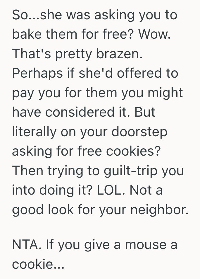 Tags: · aita, bad neighbors, baking, entitled people, free labor, guilt trip, guilt-tripping, hobbies, picture, reddit, top