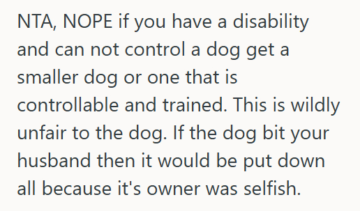 I shut him down because I also am and if the husband can’t take the dog for a walk, I go only at times I know no one will be out because I know if a dog comes running up to us, I can’t defend us well (which has happened more than once).