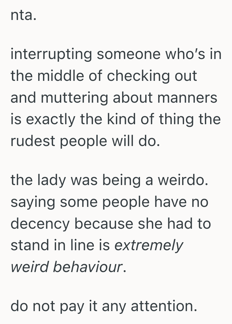 She didn’t say anything, but she let out this really exaggerated sigh and started muttering about “how manners are just gone these days” and “some people have no decency.”