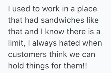 A woman called almost every morning and rudely demanded we save a sandwich to be picked up at 2:00.