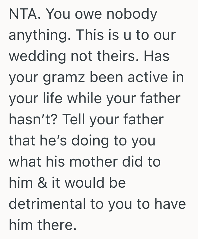 After a few days of no response his wife calls me (pf course he wouldn’t call me himself) and tells me my father will not be attending due to the fact that I invited my Gramz (his mother, who I have always had a good relationship with) and he refuses to be around her.