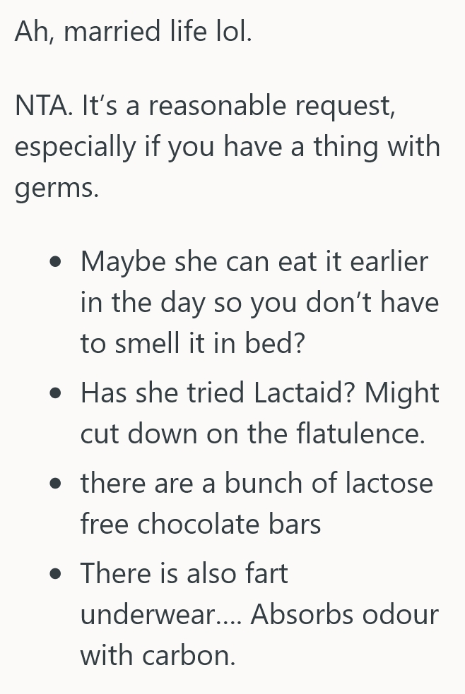 She Loved To Eat Chocolate Despite Her Lactose Intolerance, But Her Husband Is Drawing A Line On The Nighttime Gas