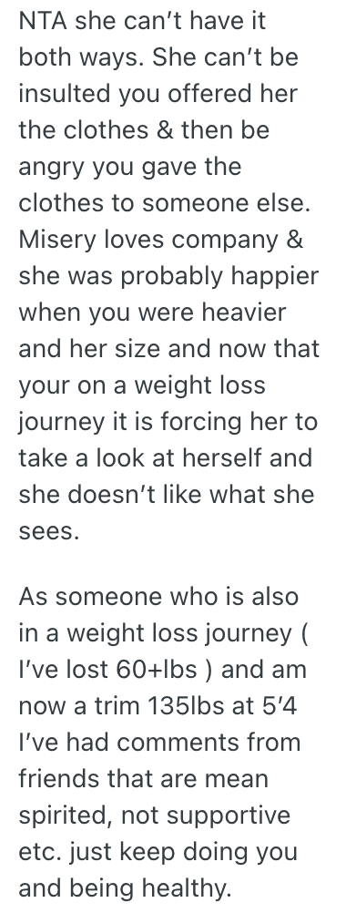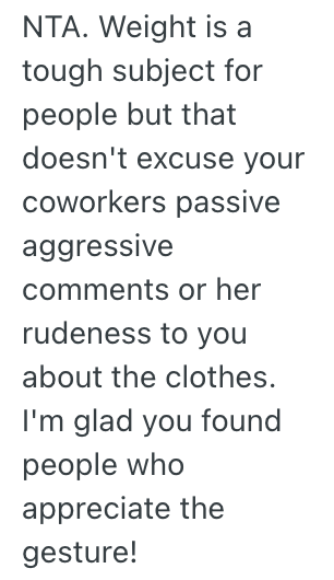 I told her they were my larger size clothes and that I had brought them for our other coworker, but she didn’t want them (I didn’t go into any details).
