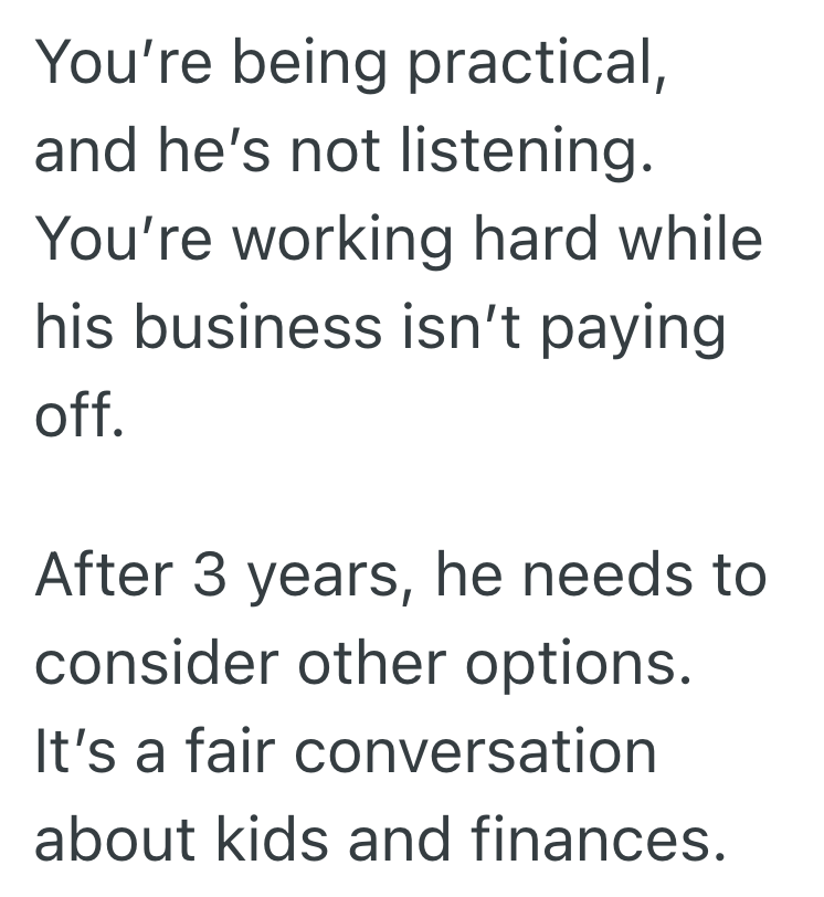 I told him at dinner that maybe if he got a real job instead of waiting years for this business to start up that we’d be able to have kids, I work my butt off everyday to make sure he has a roof over his head and he doesn’t do s***.
