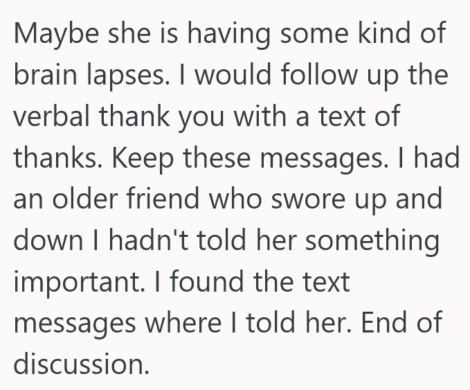 Well today (about a month later) I went again to help out, we went for food after and I said thanks, she replied with ‘oh so now you do thank me’ so I asked if I didn’t last time and she said no.