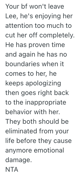 I told my BF that if he’s serious about taking this relationship to the next level (with me or any woman, for that matter), he needs to set clear boundaries with Lee or let her go entirely.