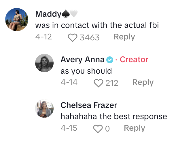 Singer and TikToker Avery Anna (@avery.anna.music) had quite the comments section on her hand after she asked for the “craziest, FBI-girlfriend thing you’ve done.