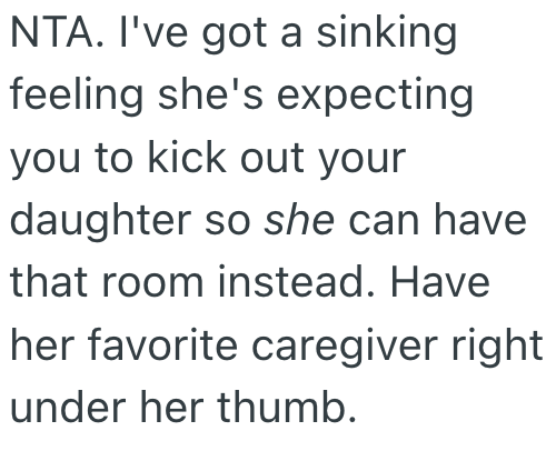 I suspect she may want to push me to kick C out so she could move in with my husband and I and force me to be her full-time caretaker.