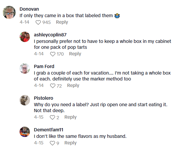 She wraps up the video showing her piles of Pop-Tarts, some with a “B” (for Blueberry) and some with an “S” (for Strawberry) and she says, “So they don’t open the wrong one and then leave it to get stale?”