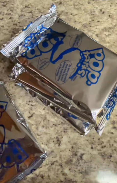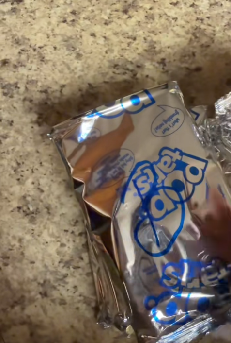 The view starts off showing a Pop-Tart foil package with a blue permanent marker writing on it, and she says, “Guys. Pop-Tarts, this is for you. If you’re not Pop-Tarts, you can scroll on. If you want to stay, you can stay, but it is 2025…”
