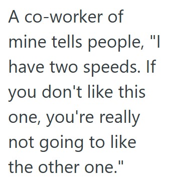 She calls out “WHAT THE HECK” and I said “Well you asked me if I could go slower than slow. I was just filling your request”.