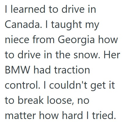 The only thing I’m surprised with is how her car is still intact as she drove faster than Lightning McQueen, in deep snow/ice.