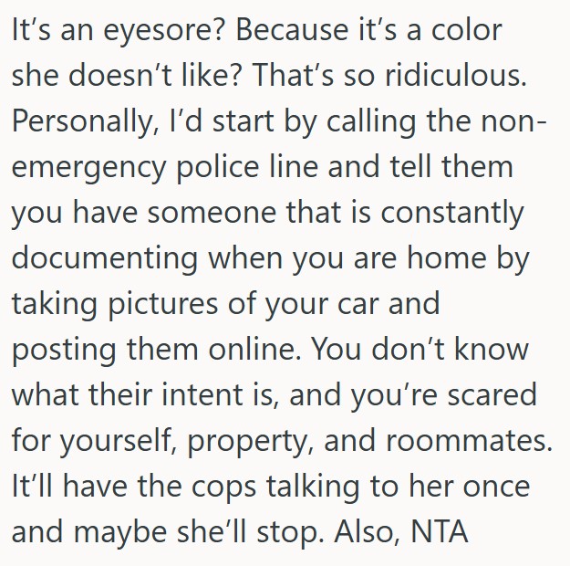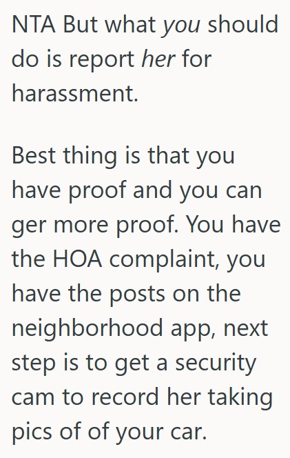 I thought that was the end of it, but then she sent a complaint to the HOA, and when that didn’t work she started posting on the neighborhood app making up reasons to get upset with “the loud college kids across the way,” and lately it’s just been her coming outside to take pictures of my car after I park it in the driveway.