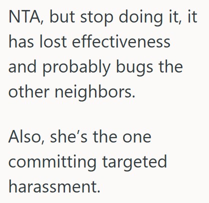 I did it again today when I got home from work and saw her, and she ended up leaving a note in our mailbox saying that I was being childish and disruptive and she was going to report me for targeted harassment.