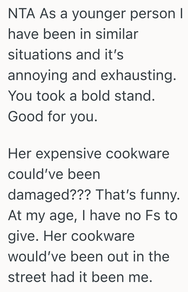 When she got home the next day she FLIPPED OUT, saying i had no right to touch her stuff, that some of it was expensive cookware that could get damaged, and that she was planning to clean it when she got back.