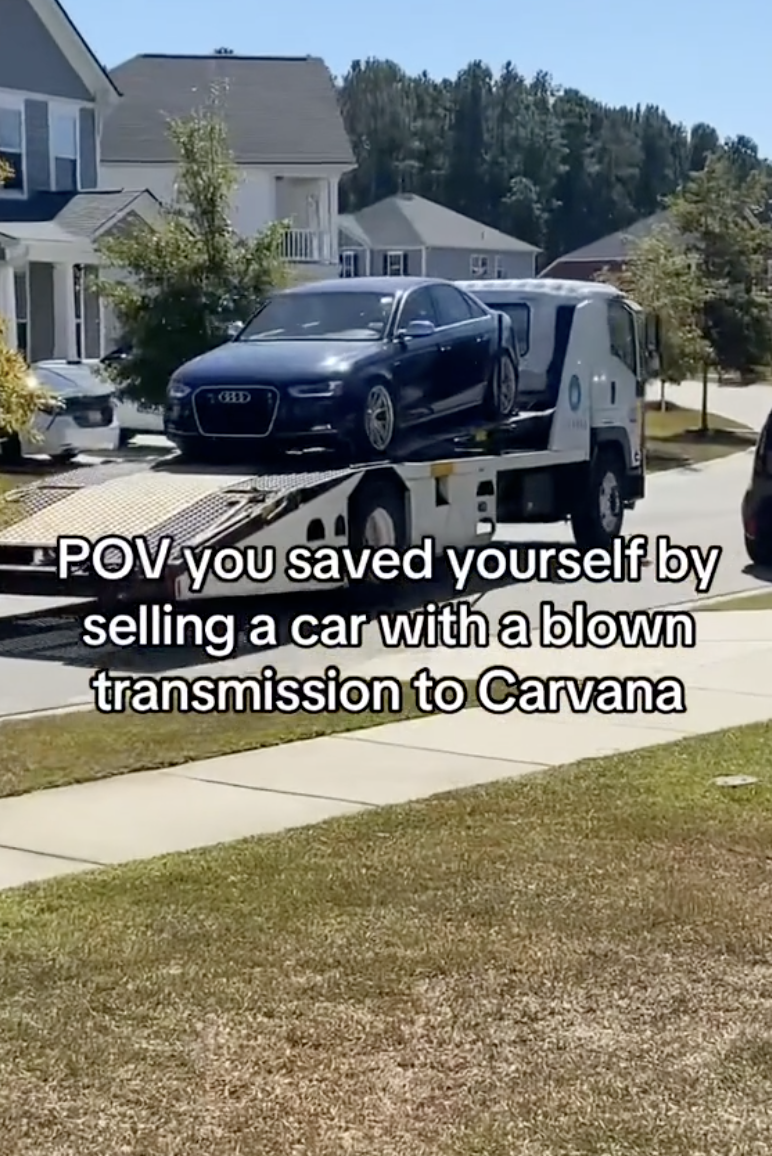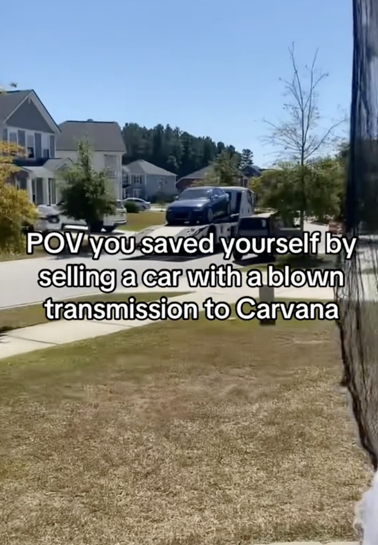 The text overlay on the video reads, “POV you saved yourself by selling a car with a blown transmission to Carvana.”