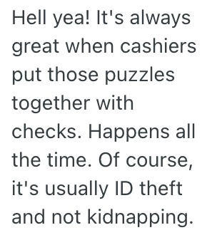 He bought a few items, but had beer. I of course ID him, and he shows it to me, and I total everything. He pulls out a check book, and writes a check.