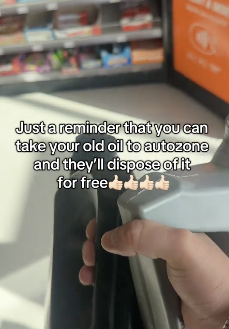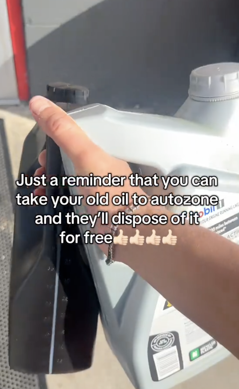 The text overlay to the video reads, “Just a reminder that you can take your old oil to AutoZone and they’ll dispose it for free.”