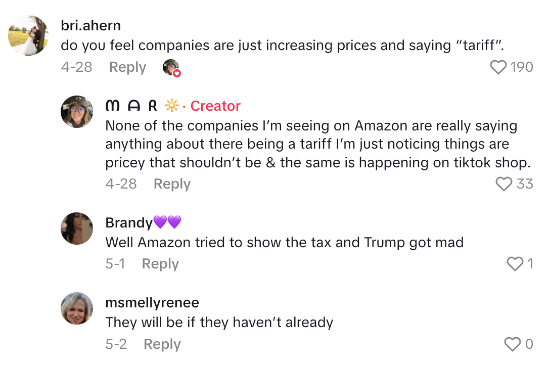 “These companies are jacking their prices up triple and quadruple to 10x cover the the tariff fee,” she says.