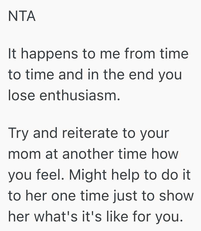 Being interrupted can be annoying, but her mom was really interested and listening. I can see why they’d both be annoyed with each other for how things played out.