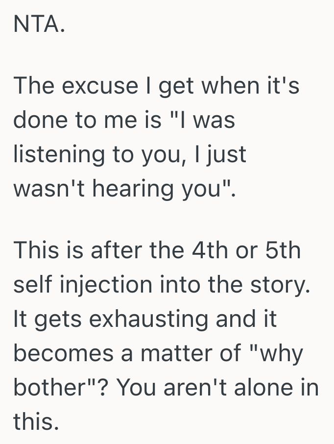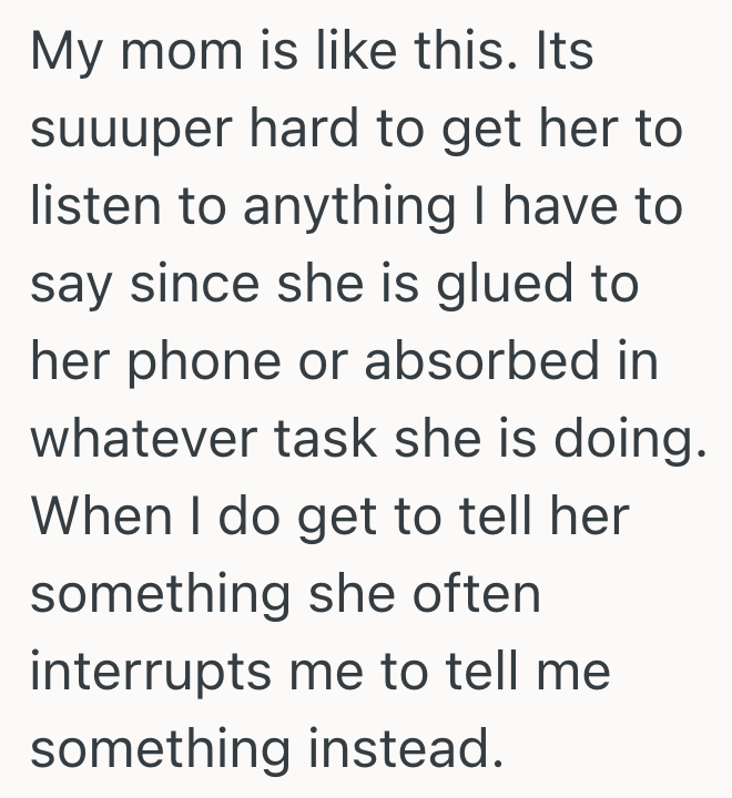 Now normally this wouldn’t be a big deal but this exact situation where me or my brother (30 M) would be telling her a story and just as we were getting invested in it, she would interrupt by saying something completely irrelevant and usually just to tell us to do a quick thing; fix t-shirt, comb hair, push a cup from the edge of the table, you get it.