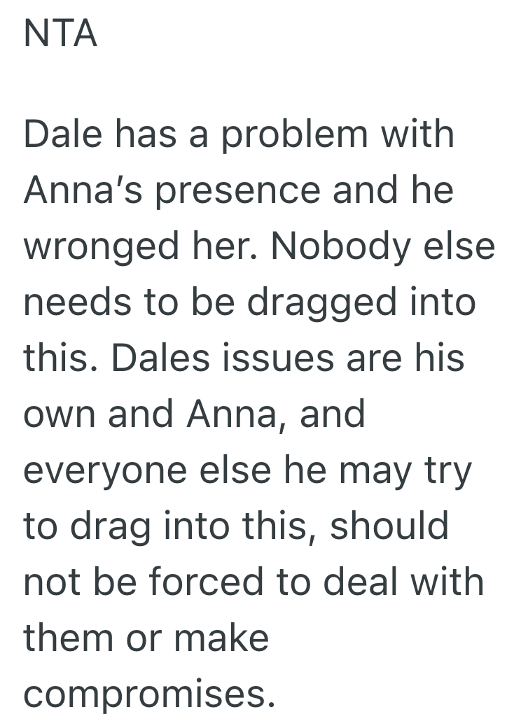 Most people are on my side, except a few High-School friends that think I should humor Dale for just a few parties and ask her to stay away for a little bit so he can get over her.