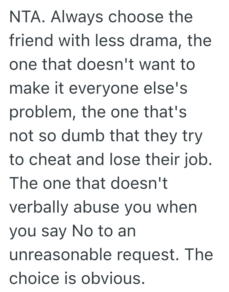He said that I wasn’t being a good friend and I was going to have to decide if it was him or her because he wasn’t going to be in the same room as her.