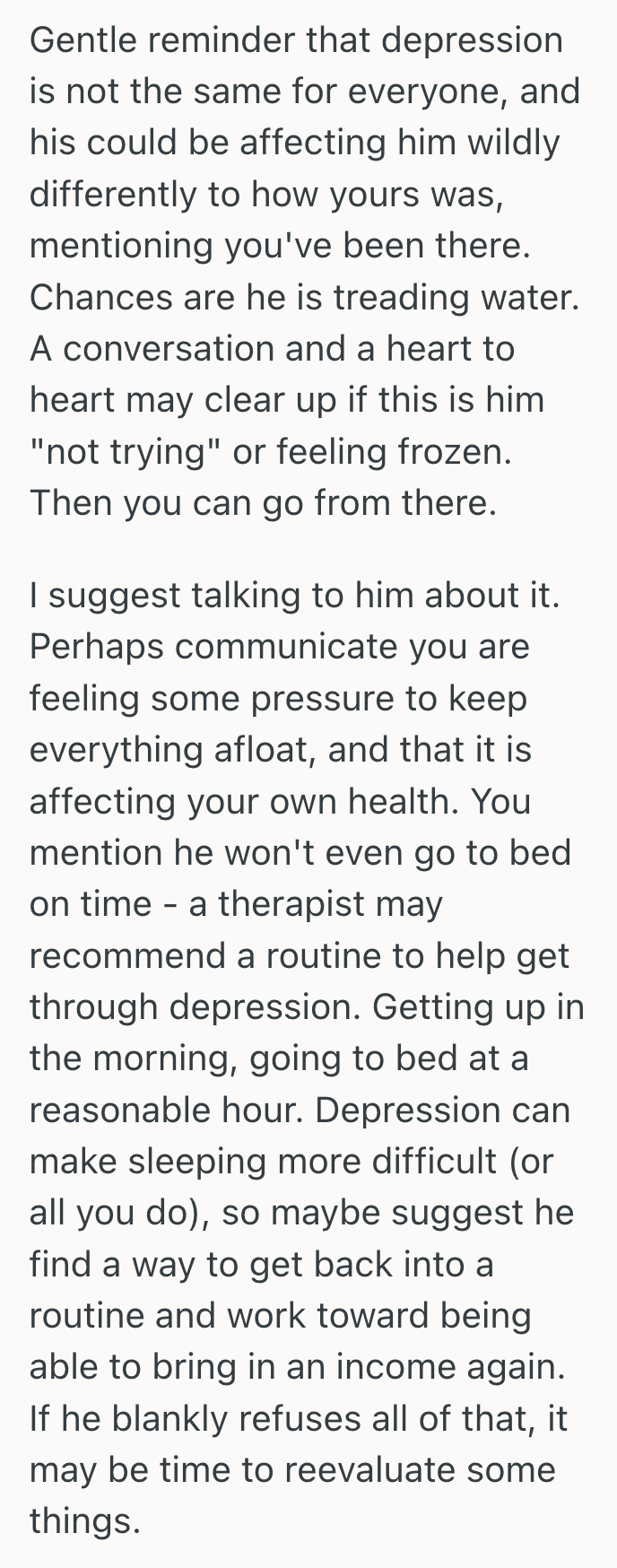 Perhaps the two can collaborate on healthier habits to start incorporating to help kick his depression.